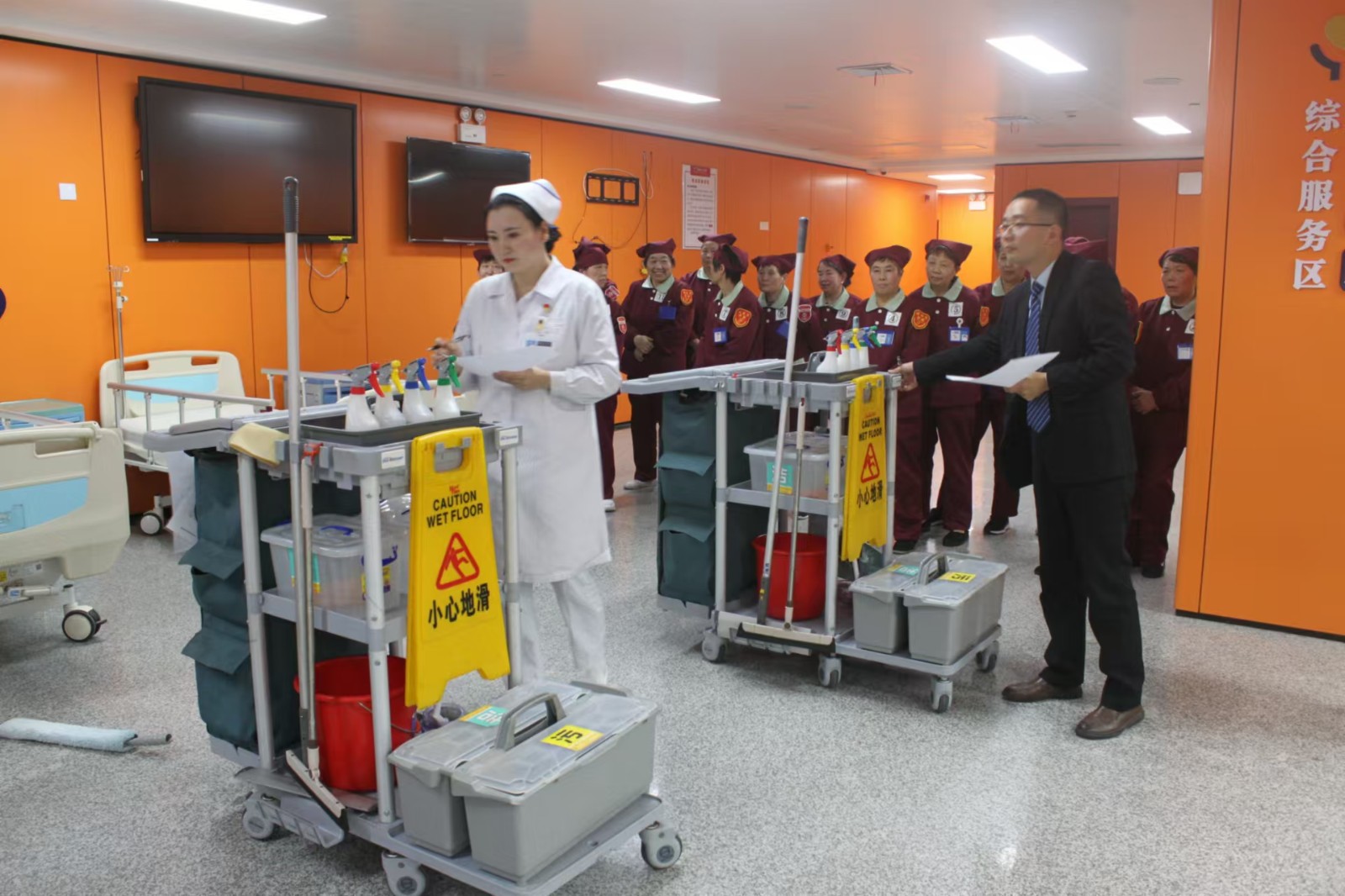 本次技能竞赛由总安处、感控处、护理部、科室护士长代表以及筑诚集团公司品质部经理担任评委;比赛共分为院感应知应会理论问答、保洁车规范摆放、出院床单元终末消毒三个部分,评委们不仅现场观摩了比赛,还对参赛员工的表现进行了认真评审,并在比赛结束后对不足之处进行了耐心的讲解和指导。
