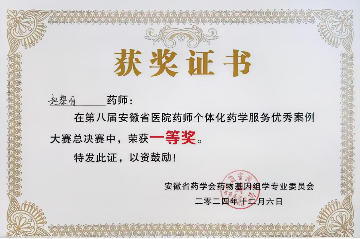 近日,在第八届安徽省医院药师个体化药学服务优秀案例大赛中,P站 赵黎明药师从全省近300 名参赛药师中脱颖而出,荣获一等奖。