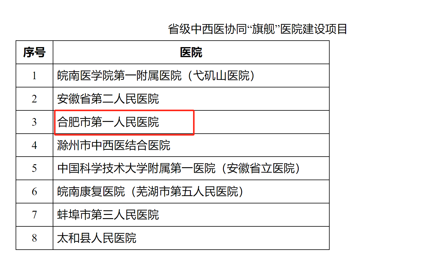 近日,在安徽省中医药管理局公布的8家省级中西医协同“旗舰”医院建设项目中,合肥市第一人民医院顺利通过遴选评审,榜上有名。