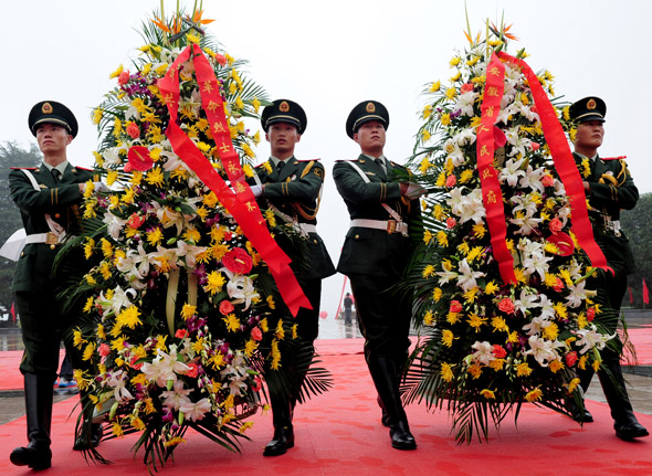 名礼兵抬起花篮,正步走向烈士纪念碑,将花篮摆放到纪念碑基座上。张宝顺、王三运缓步上前,在花篮前驻足凝视,仔细整理花篮上的红色缎带。随后,全体肃立,以深深的三个鞠躬,向长眠于此的革命先烈,表示深切怀念和崇高敬意。