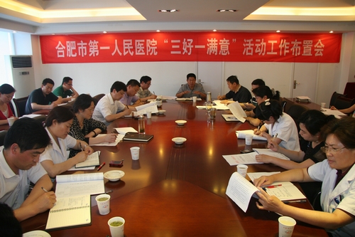 下午3点,合肥市第一人民医院集团本部鸿兴宾馆5楼会议室,2012年合肥市第一人民医院“三好一满意”活动工作布置会如期举行,副院长文刚主持会议,院党委副书记、副院长李建中亲自带领院办、团委、监察室、工会、医务、护理、财务、采购、后保、信息等部门的负责人学习并下发《2012年合肥市第一人民医院“三好一满意”活动工作方案》(院发〔2012〕40号)。