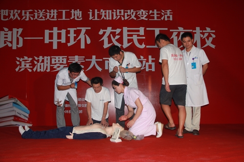 急诊部李从圣、徐俊、于立凡医师及曹靖宇护士分别演示并亲手指导农民工兄弟在遇到中暑、气道异物、呼吸心跳骤停的病人时在120赶来之前所能进行的院前急救操作,尽最大努力挽救病人的生命,提高抢救的成功率。
