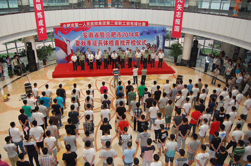 8月 2日上午 9时 ,安徽省暨合肥市夏秋季征兵体检开检仪式在合肥市滨湖医院举行。安徽省征兵工作全面展开。据了解,今年征兵将试行新的体检标准和办法,在身高、体重和视力标准等方面都有所调整,征兵工作至 9月 30日 结束,全省86个体检站将陆续开检。