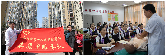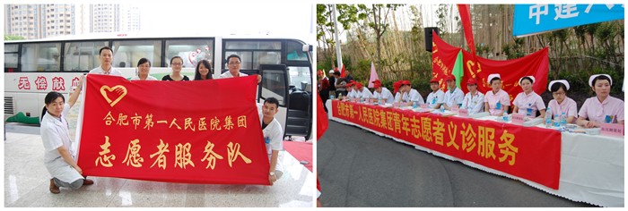 合肥市第一人民医院志愿者服务队由内科支队、外科支队、医技支队、护理支队、行政后勤支队和蜀山分院支队六个支队组成,共有医务人员300余人,涵盖了几乎所有的门诊医技、行政后勤和临床科室。秉承“奉献、友爱、互助、进步”的中国青年志愿者精神,服务队带领广大志愿者开展了门诊咨询、义诊服务、敬老爱老、卫生宣传、抢险救灾、扶贫济困、交通劝导、义务献血、大型活动志愿服务等各项志愿服务活动。据不完全统计,该服务队年均组织各种志愿者活动可达4000人次、17900小时,服务对象800000余人。