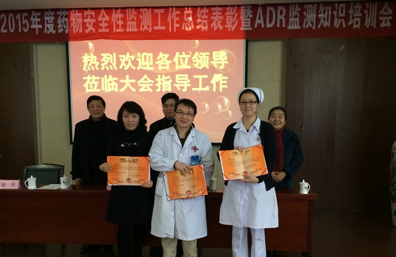 首先由监测办吴文副主任汇报了2015年度院药物安全性监测工作总结,随后胡景春副部长宣读了医务部的表彰文件,奖励2015年度在该项工作中取得优异成绩的临床科室与个人。急诊输液中心、血液肿瘤科、儿科荣获院2015年度上报ADR病例报告数前三名科室;消化科洪江龙医师、甲乳外科张丽护师、急诊输液中心周燕护师三位同志荣获填报质量优秀奖,朱红副院长、胡景春副部长、药学部范鲁雁主任分别为表彰科室和个人进行了颁奖。