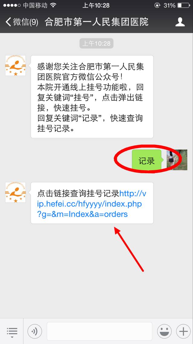 进入微信公众号:合肥市第一人民集团医院,回复“记录”,即可快速查询个人挂号记录点击右上角小图标,一键查询个人挂号记录