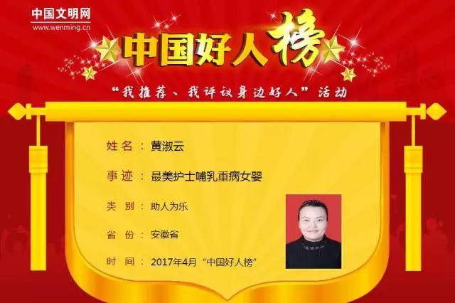黄淑云是合肥市第一人民医院急诊部护士。今年年初七夜,一名患有严重先天性心脏病的女婴被遗弃在滨湖医院。得知孩子急需补充糖水以提高血糖时,急诊科正处于哺乳期的护士黄淑云主动抱起奄奄一息的孩子给其喂奶。这一幕被同事拍下并发到朋友圈,获得众多“点赞”,大爱之举感动无数人。先后当选“合肥好人”、“安徽好人”。