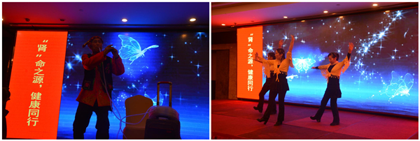 多才多艺的肾友们也带来了精彩的节目。 76 岁的民间老艺术家唐浩老先生,前几个月被诊断为尿毒症,正当他对未来的生活感到绝望的时候,在医护人员的悉心劝说下,接受了透析治疗,又重新回到了他热爱的舞台。唐老先生现场送上了锦旗,“医德高尚,医术精湛”,感谢肾内科对患者无微不至的照顾。而后唐老先生不仅演奏了“月光下的凤尾竹”,还用鼻孔连接上一根长达 100 米的塑料管来演奏葫芦丝,堪称一绝。透析 9 年的患者徐丽丽也带来了舞蹈“康巴情”,舞出了对生活的热爱,对生命的追求。张泽培作为肾友代表,分享了自己的血透经历,鼓舞了更多的肾友树立积极乐观的心态,调整情绪,配合治疗。