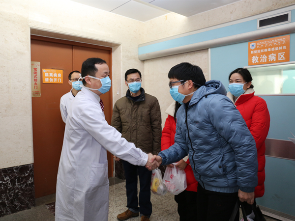 月12日下午,合肥市滨湖医院4名新冠肺炎治愈患者出院。走出隔离病房后,该院新冠肺炎专家组组长丁震与他们每一个人亲切握手。丁震说,在不提倡握手的当下,他坚持与每一名出院患者握手,是想给他们传递信心。