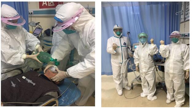 一系列的抢救工作有条不紊的展开着。他们忘记了时间,护目镜已被汗水浸湿,模糊成片。在他们努力下,病人生命体征平稳,血氧饱和度上升到95%。他们顺利的完成了抢救工作,把病人安全的护送至ICU病房。事后,他们三人瘫坐在板凳上,相视一笑,又投入到新的战斗中去!