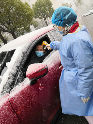 体检中心的工作人员来说,却又是一场严峻的寒冷考验。白班是体检中心的周雯和肾内科者愿者郑倩,晚班是体检中心的徐红红和儿科志愿者陈旭琳。她们早晨6点半天还没亮就早早来到滨湖医院南门口,拿起体温枪为进入的每一辆车上的人及行人监测体温,晚上九点才能结束一天的工作,每天的测温人数都在3千人左右。