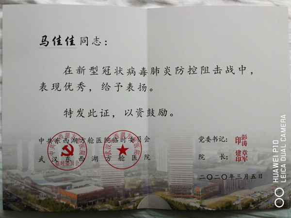 扫描,排查病情。因在此次新型冠状病毒肺炎防控阻击战中,表现优秀,被中共东西湖方舱医院临时委员会、武汉东西湖方舱医院授予荣誉证书,予以表彰。