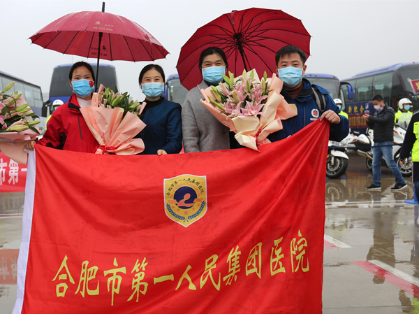 首批支援武汉的安徽省医疗队队员姚盼盼、王健平安凯旋,副院长于卫华、护理部主任潘爱红前往机场迎接。这批大年初三就紧急驰援湖北的白衣战士,在武汉的