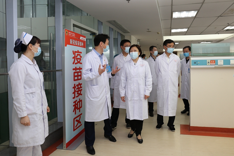 5月23日上午,安徽省卫健委主任陶仪声,省卫健委党组成员、副主任吴振宇,医政医管处处长马勇、副处长彭玉池以及院感防控专家一行在合肥市第一人民医院滨湖院区督导疫情防控和疫苗接种工作,并看望慰问防控一线的医护人员。督导组一行深入医院疫情防控重点区域、核酸检测采集区、医院门急诊、感染病院区、疫苗接种门诊,通过实地查看、听取汇报、座谈交流等方式,对医院疫情防控和疫苗接种工作落实情况进行督导。合肥市卫健委党委书记、主任秦继平陪同督导。合肥市第一人民医院党委书记吴冬雷、副院长于卫华、宁仁德及职能部门负责人参与接待。
