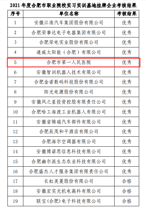 10月26日,合肥市现代职业教育集团组织评审专家,通过网上资料审核、现场陈述、实地考察等方式对合肥市61家职业院校实习实训基地挂牌企业进行考核,P站 护理部副主任余梅同志代表院方进行现场汇报及答辩。经专家组集中审议,经公示,最终认定,合肥市第一人民医院等 16 家企业考核评定为“优秀”等次,余32 家企业考核评定为“合格”等次, 3 家企业考核评定为“不合格”等次。