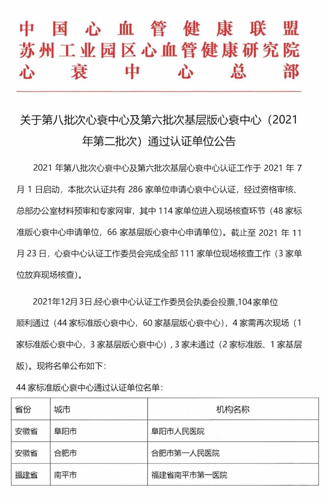 12月3日,中国心衰中心总部发布《关于第八批次心衰中心及第六批次基层版心衰中心(2021年第二批次)通过认证单位公告》,经过资格审核、总部预审、专家网申及现场核查,合肥市第一人民医院顺利通过认证,成为合肥市市级医院中首家国家级标准版心衰中心。