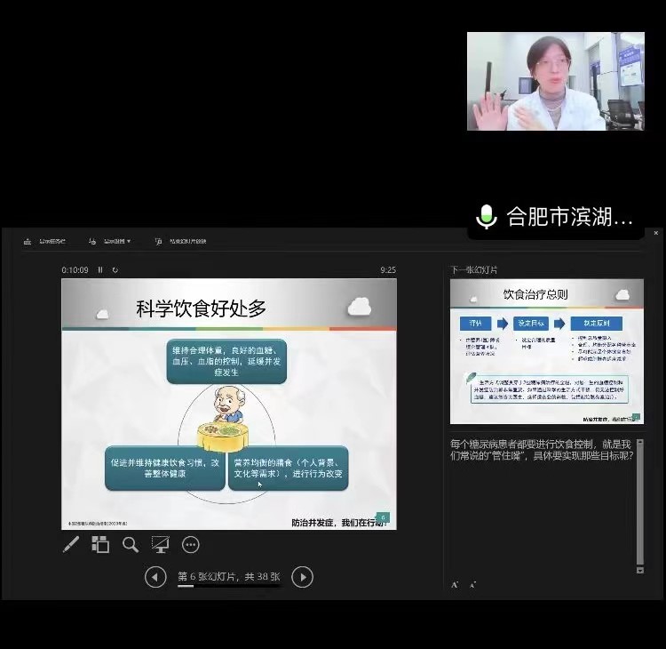 义诊的同时,在门诊2楼互联网医院,王国娟主任和叶启宝副主开展了《糖尿病患者饮食管理》和《糖尿病并发症预防》的患教讲座。讲座是线上与线下同时进行,它借助互联网平台,让广大糖友足不出户就能听到专科医生的讲座,还可以与专家线上互动,学习有关糖尿病的知识,从而提高疾病的自我管理能力。
