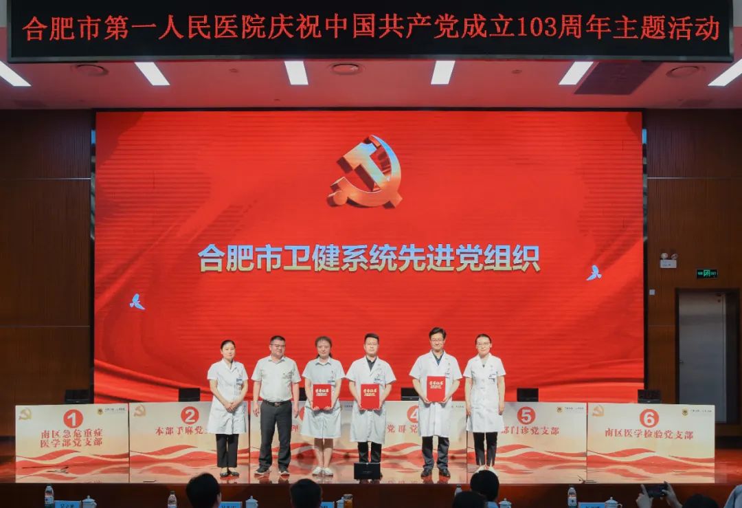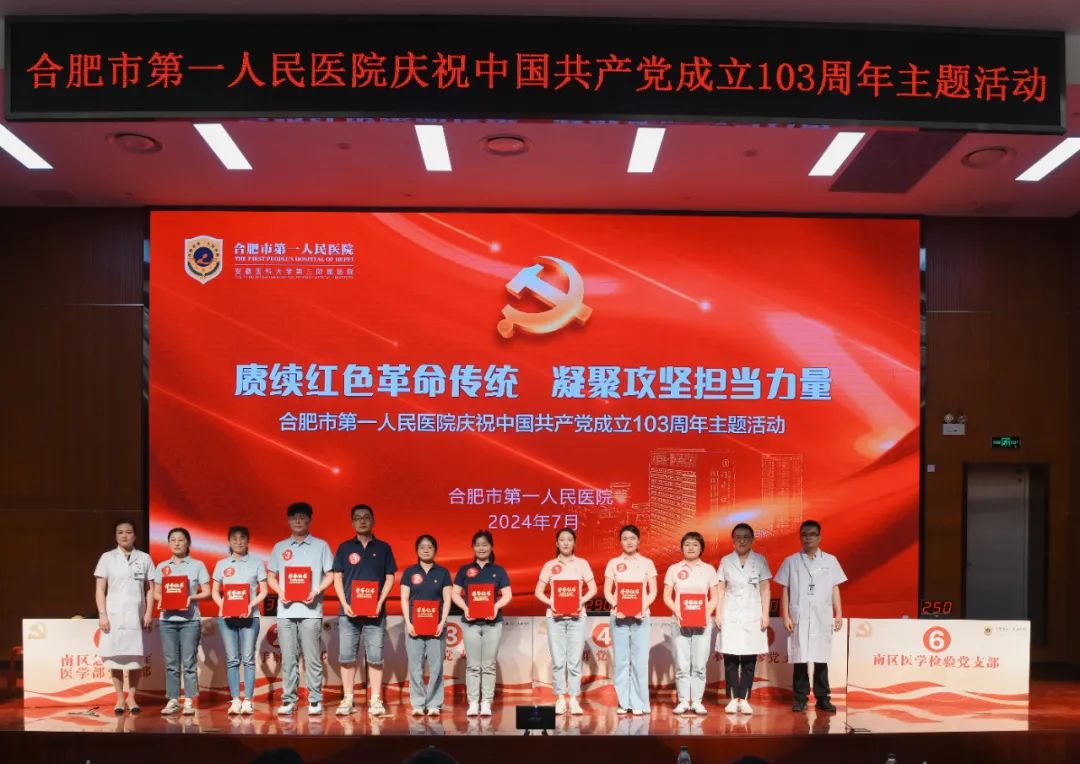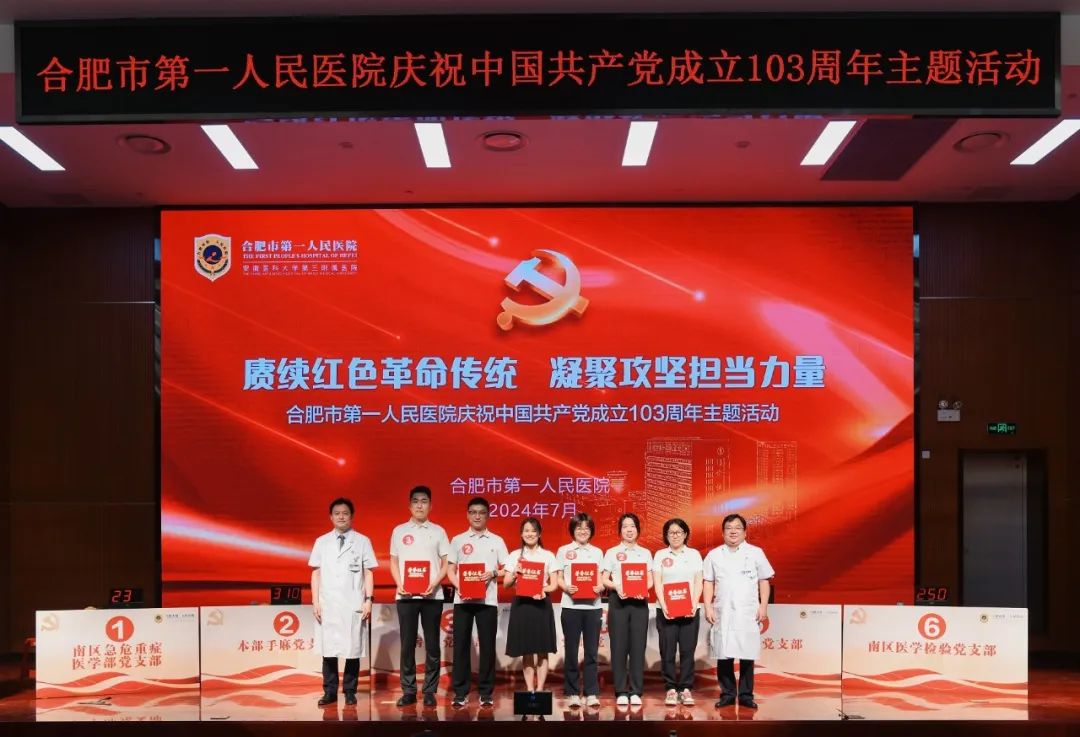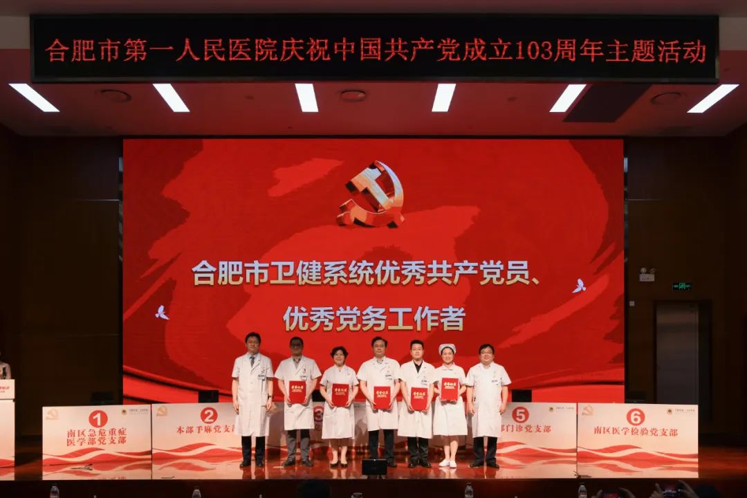 7月1日上午,合肥市第一人民医院在本部院区举办庆祝中国共产党成立103周年主题活动,颁发“光荣在党50年”纪念章,表彰“两优一先”,同时开展党建知识竞赛决赛。市卫健委党委书记、主任张晓峰,市卫健委办公室主任吴立光,市一院领导班子全体成员,50年党龄老党员出席活动。各党总支、党支部书记,职能部门负责人,科主任和护士长代表,民主党派代表等参加活动。
