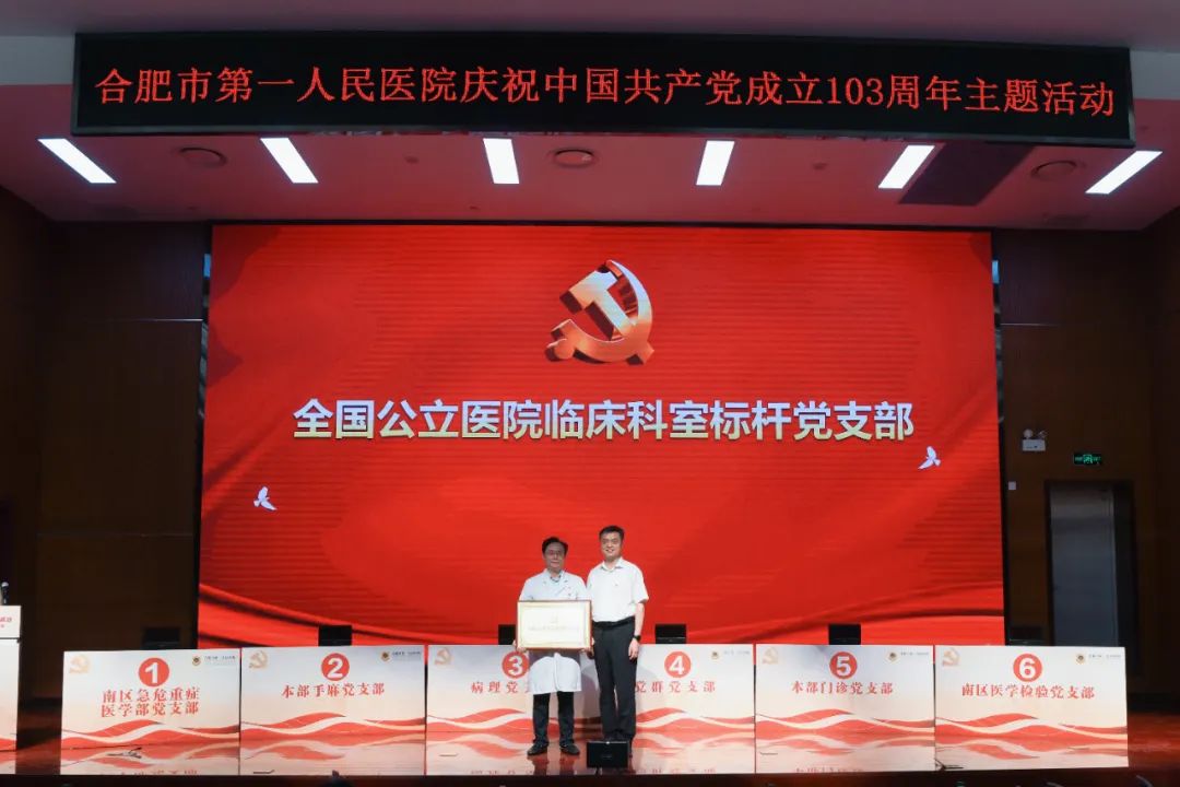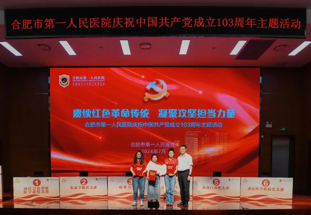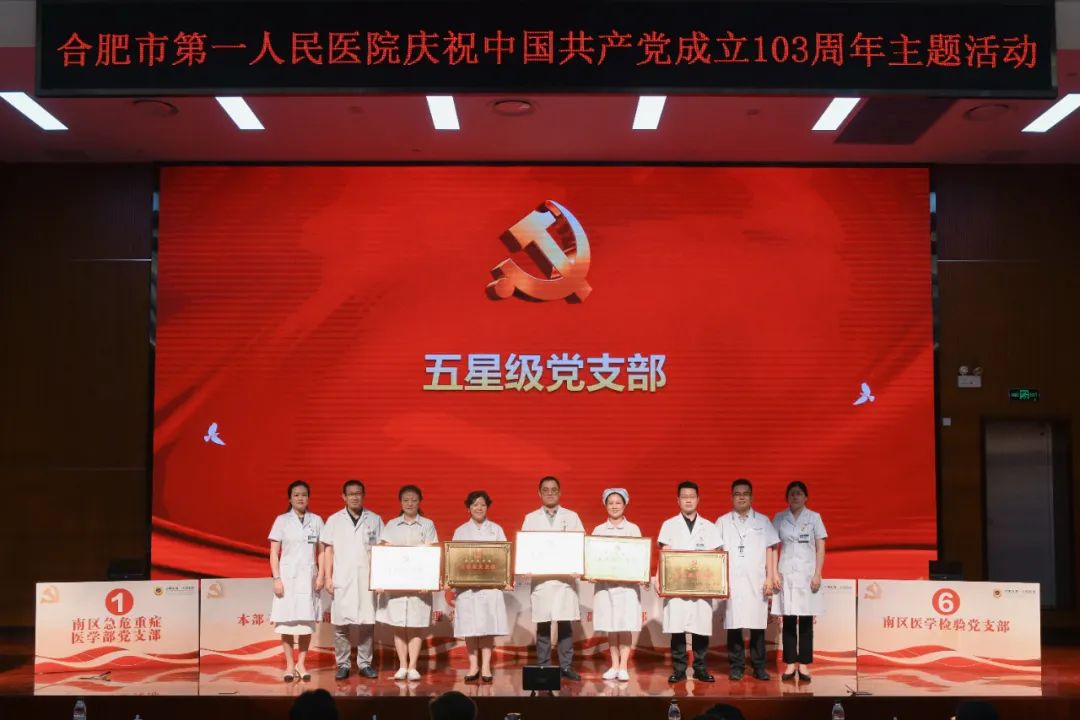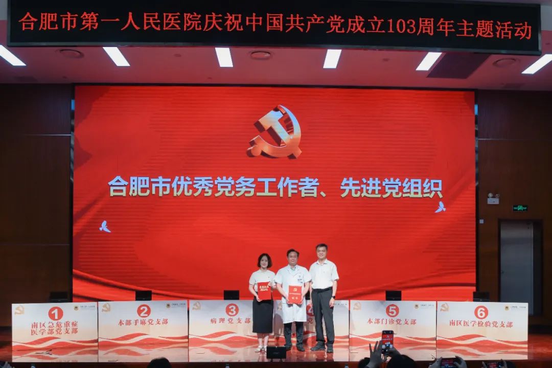 7月1日上午,合肥市第一人民医院在本部院区举办庆祝中国共产党成立103周年主题活动,颁发“光荣在党50年”纪念章,表彰“两优一先”,同时开展党建知识竞赛决赛。市卫健委党委书记、主任张晓峰,市卫健委办公室主任吴立光,市一院领导班子全体成员,50年党龄老党员出席活动。各党总支、党支部书记,职能部门负责人,科主任和护士长代表,民主党派代表等参加活动。