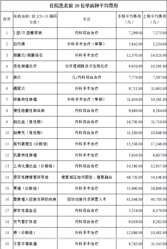 医疗机构住院患者单病种平均费用