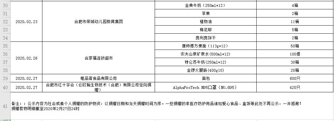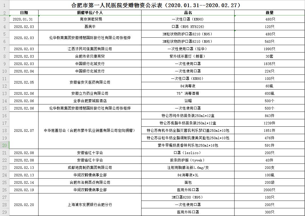 合肥市第一人民医院受赠物资公示表(2020.01.31--2020.02.27)