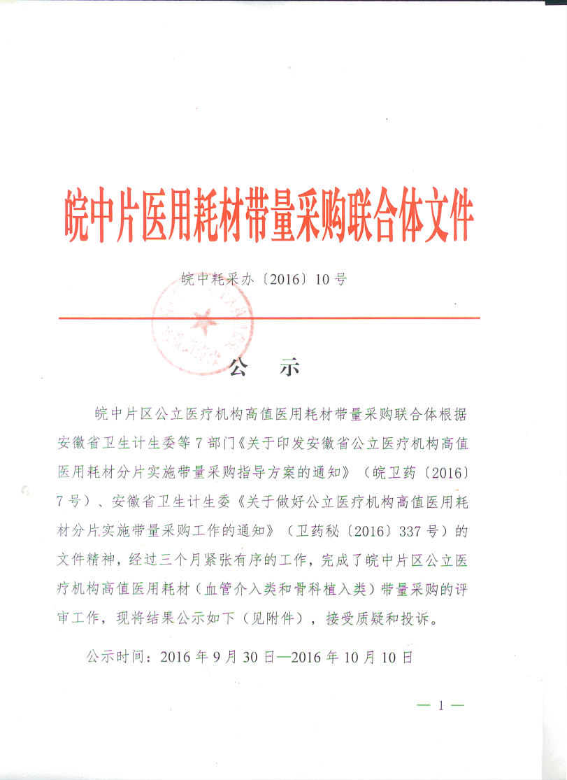 皖中片医用耗材带量采购联合体文件公示