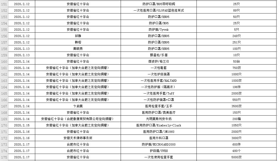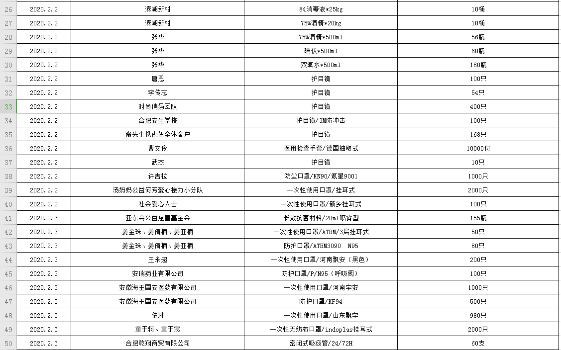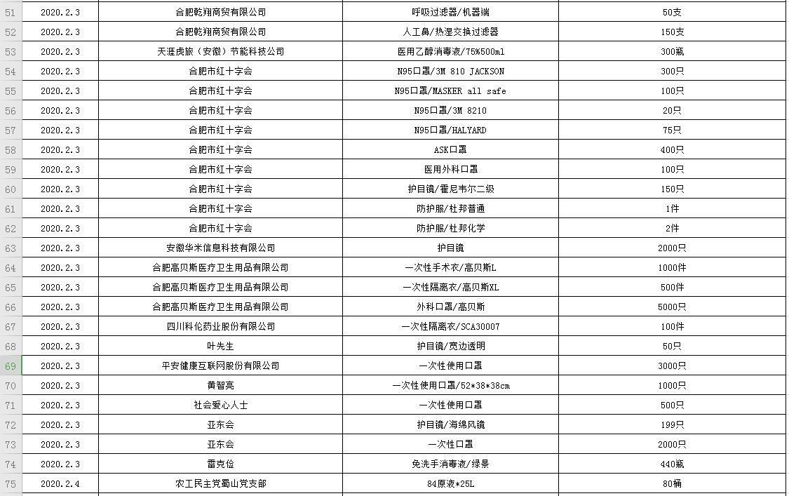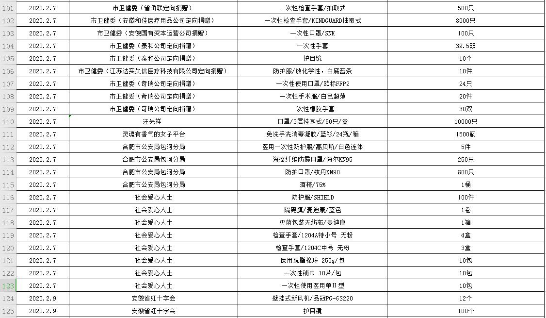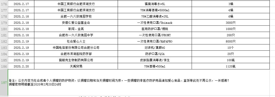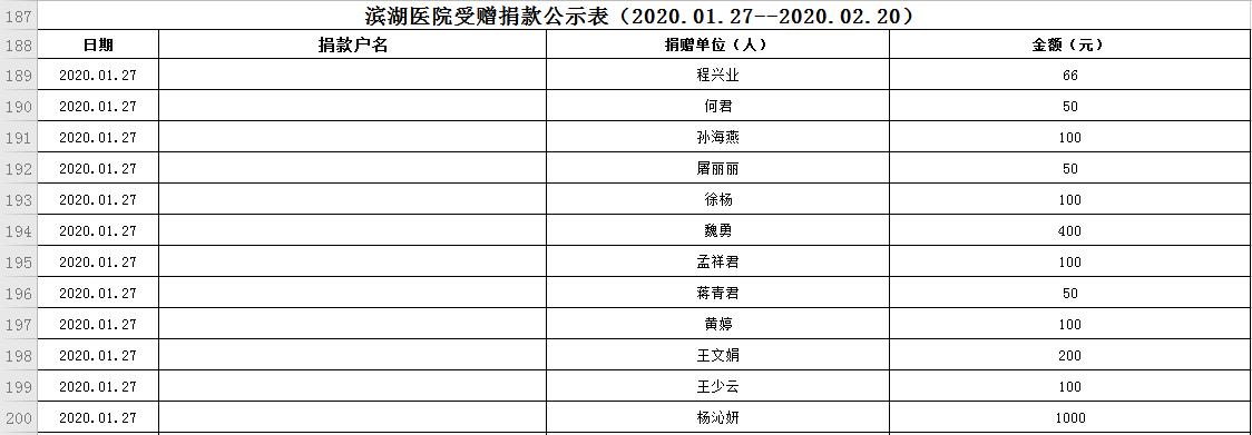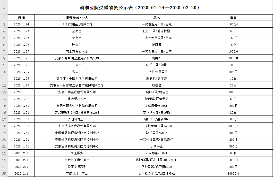 滨湖医院受赠物资公示表(2020.01.24--2020.02.20)