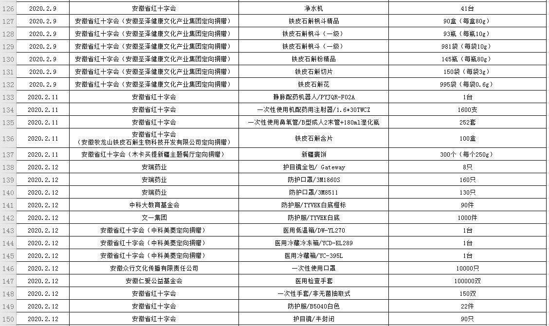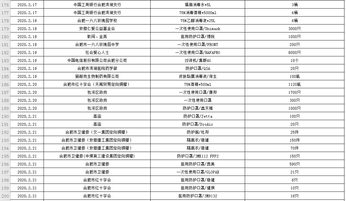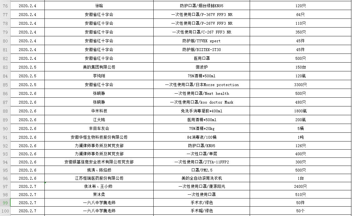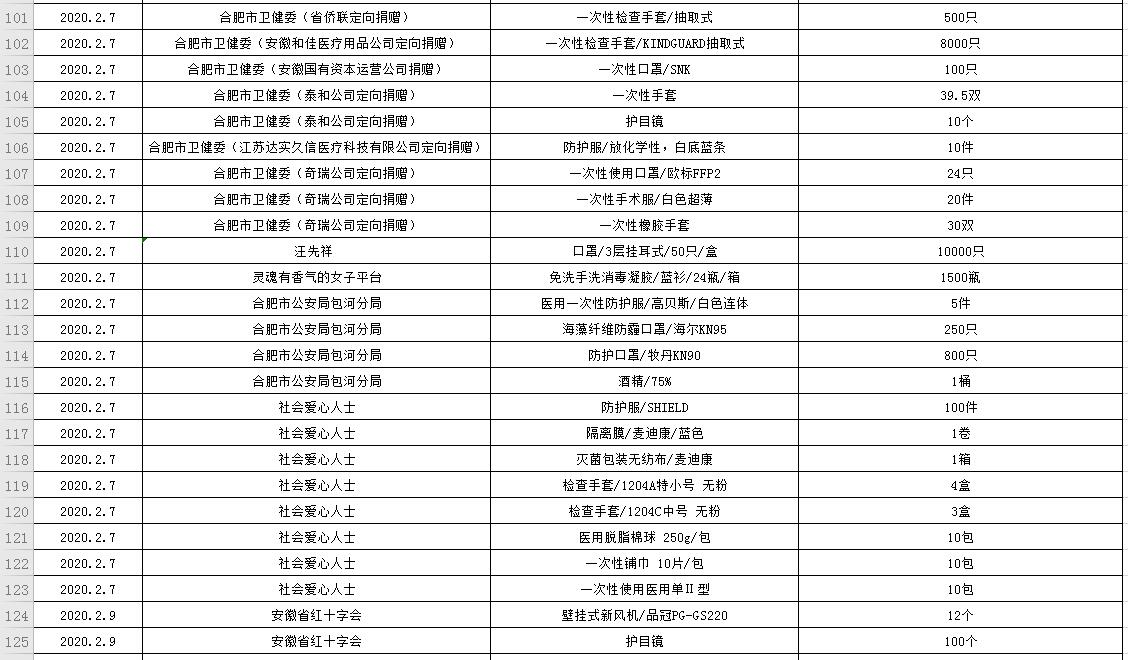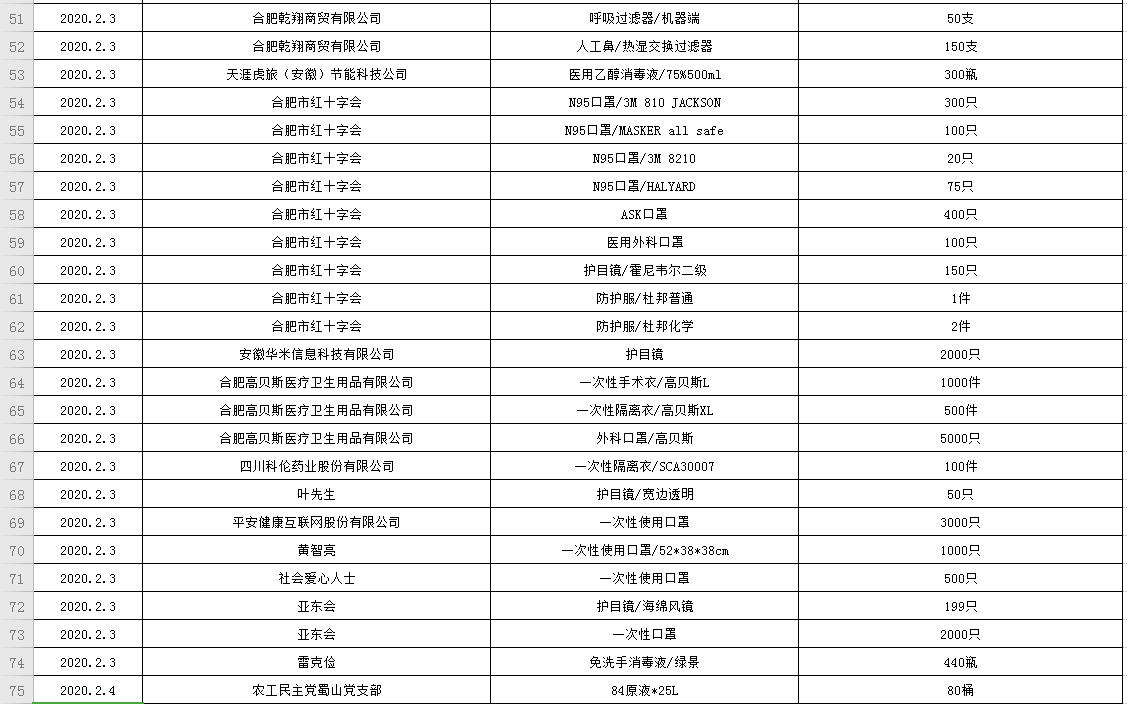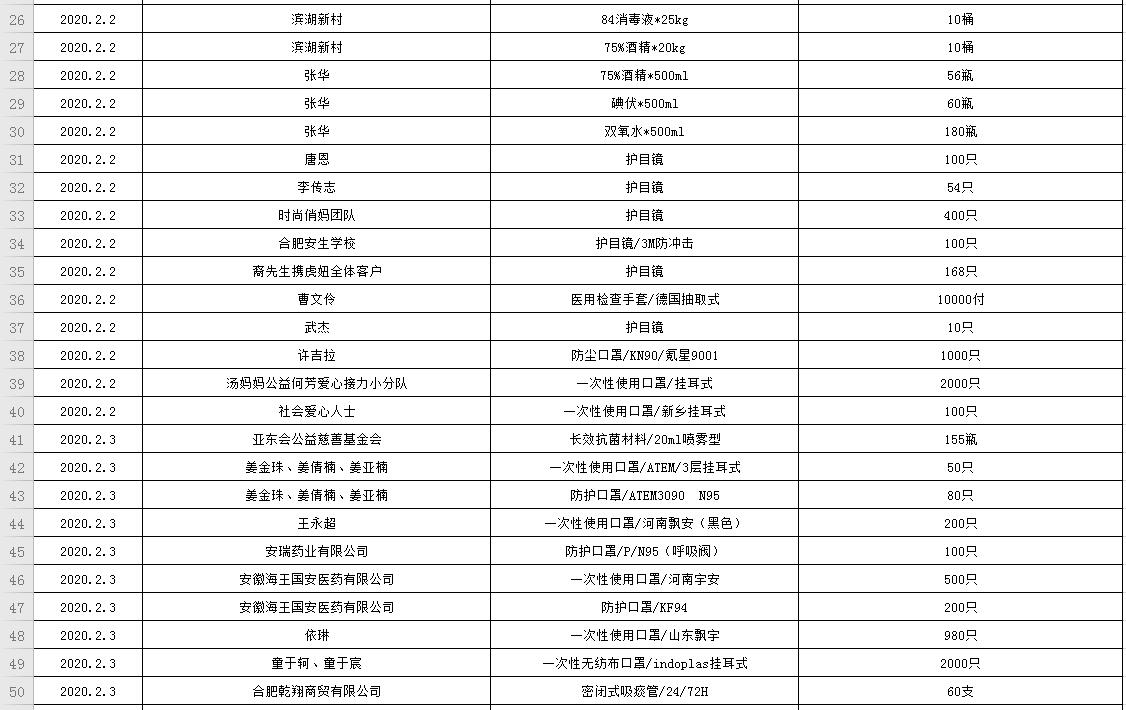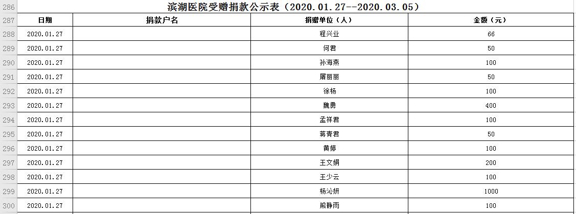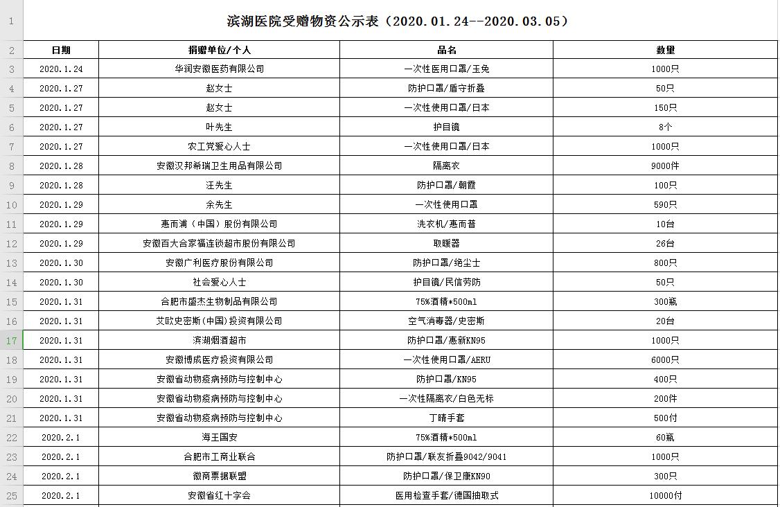 滨湖医院受赠物资公示表(2020.01.24--2020.03.05)