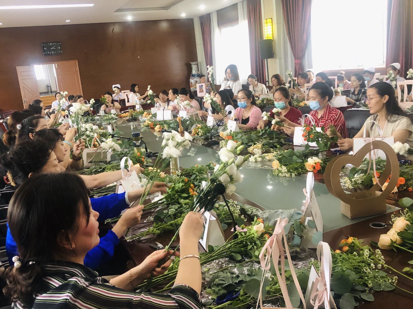 虽然窗外下着雨,活动现场气氛热烈融洽,阵阵花香扑鼻而来,花艺老师通过细致的讲解,介绍了插花艺术的基本知识、插花造型、器具及花的品种等内容,职工们都认真聆听,仔细观摩,跟随着老师的讲解步骤将花朵进行修枝剪叶,精心搭配,依照顺序错落有致地搭配在一起,参加活动的每位职工都兴致勃勃,看着亲手设计的插花作品充满了成就感与喜悦感,享受着工作之余集体创作的乐趣。