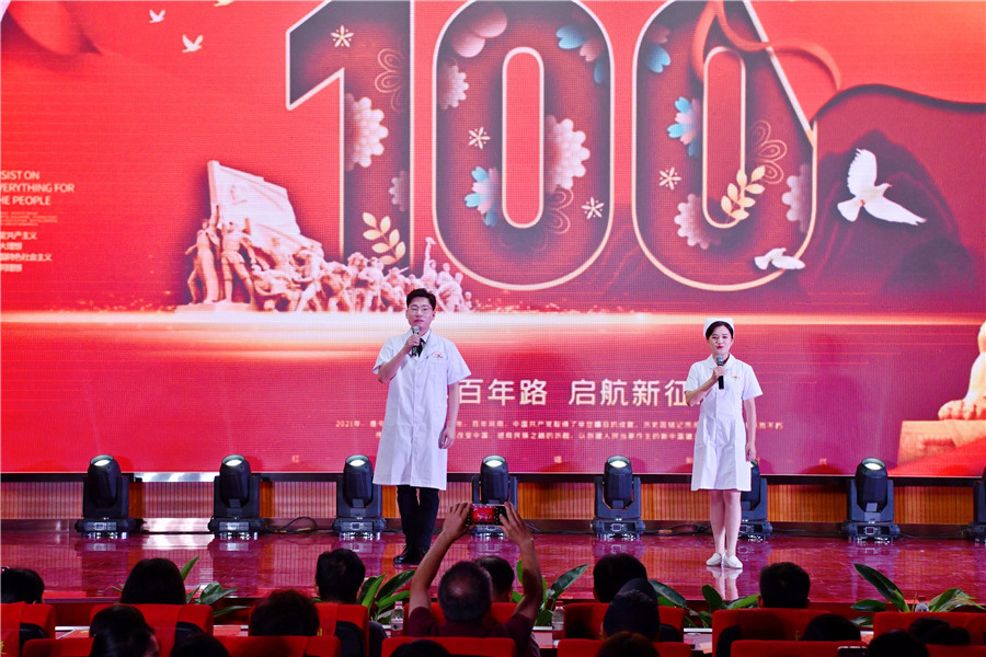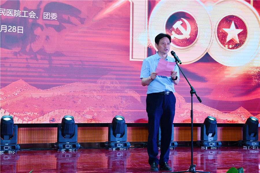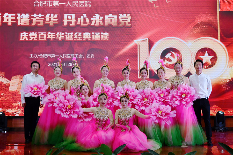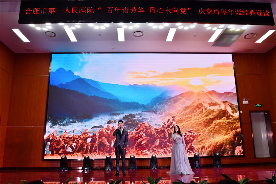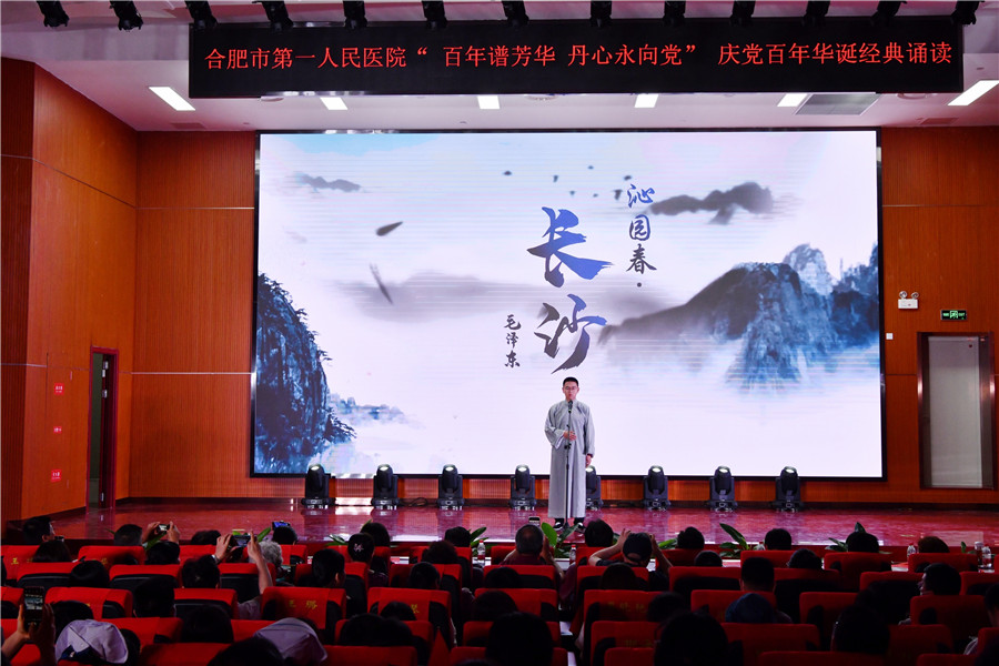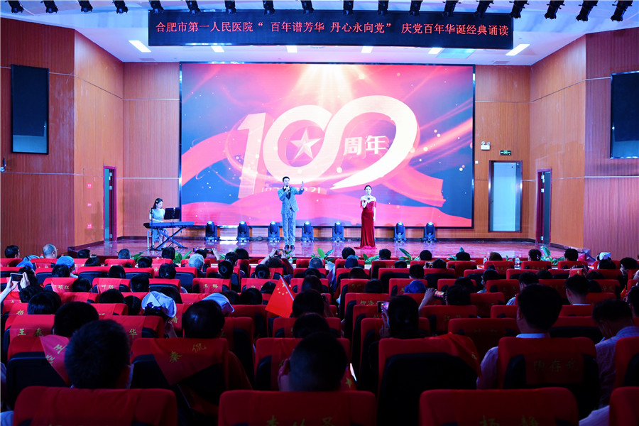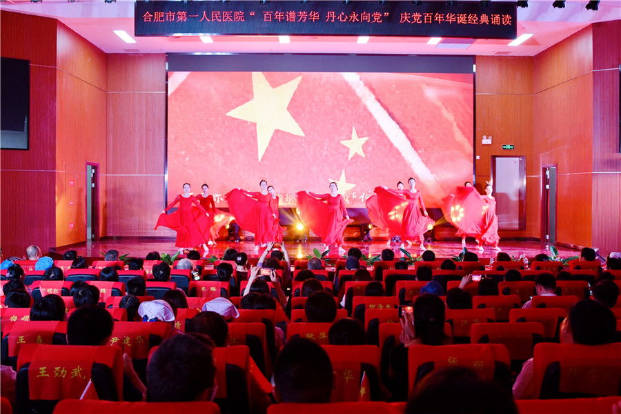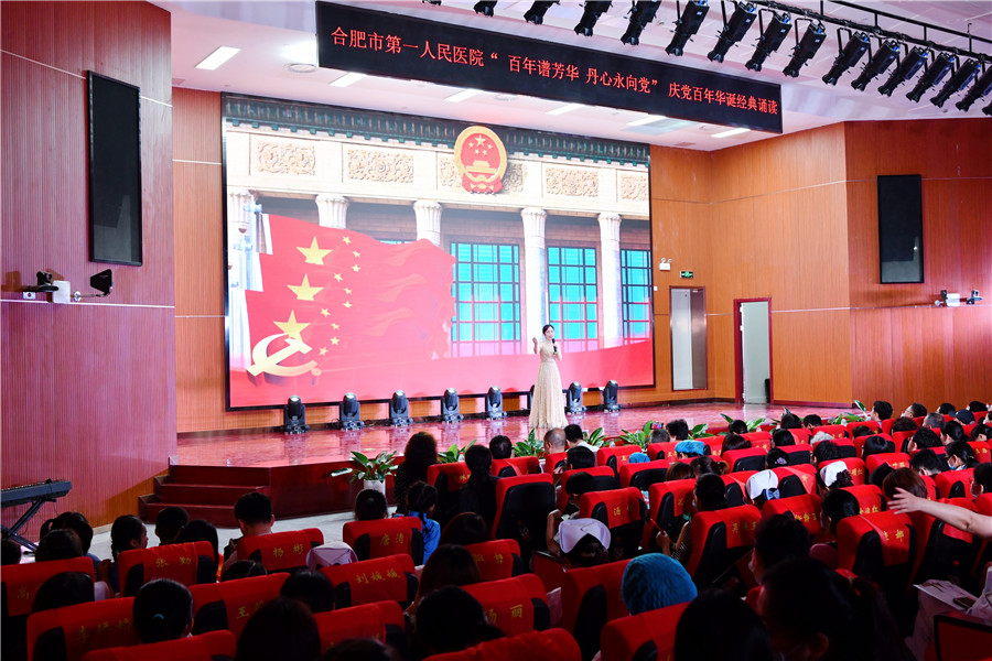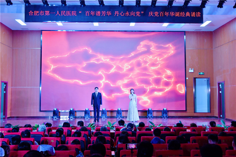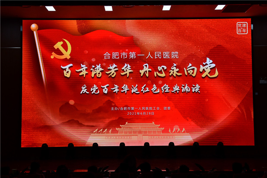 百年征程波澜壮阔,初心未变历久弥坚。为庆祝中国共产党建党100周年,推动党史学习教育学深做实,6月28日下午,由工会和团委主办的合肥市第一人民医院“百年谱芳华 丹心永向党”红色经典诵读在新综合体大楼大礼堂举行,院领导、科主任、护士长、支部党员及离退休职工代表现场观看。院党委书记吴冬雷致辞。