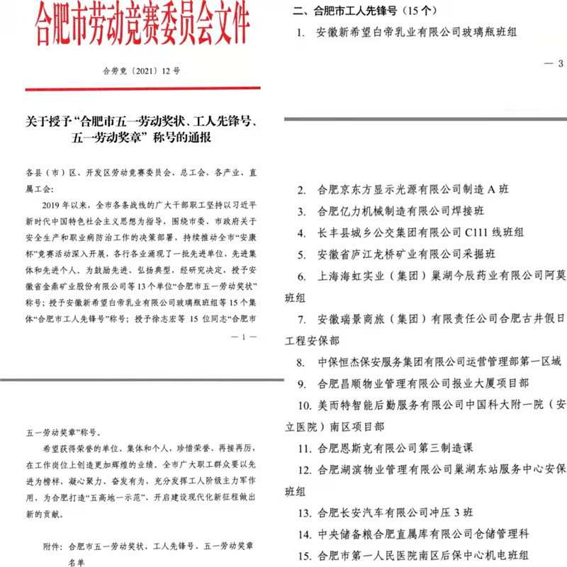 为鼓励先进、弘扬典型,近日,合肥市第一人民医院南区后保中心机电班组被合肥市劳动竞赛委员会授予“合肥市工人先锋号”荣誉称号。“工人先锋号”荣誉是以立足岗位,争创一流为内容,营造劳动最光荣、劳动最崇高、劳动最美丽的社会风尚和精益求精的敬业风气。本次后保中心机电班组能够获此荣誉既是对它们过往工作的肯定,也是对班组继续奋进的鞭策。后保中心机电组始终坚持以“安全第一、预防为主、”的工作方针,将安全管理工作纳入责任制考核,安全工作做到了有计划、有目标、有检查、有考核,实现了各种安全事故零发生,是一支人员结构合理、专业素质强的队伍。
