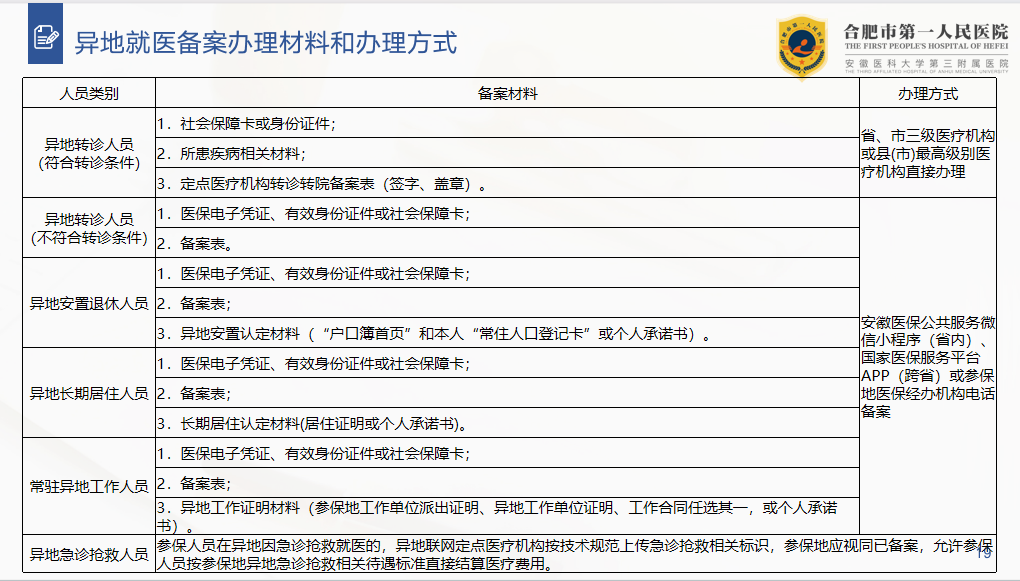 异地转诊人员 (不符合转诊条件) | 1.医保电子凭证、有效身份证件或社会保障卡; 2.备案表。 | 安徽医保公共服务微信小程序(省内)、国家医保服务平台APP(跨省)或参保地医保经办机构电话备案 |