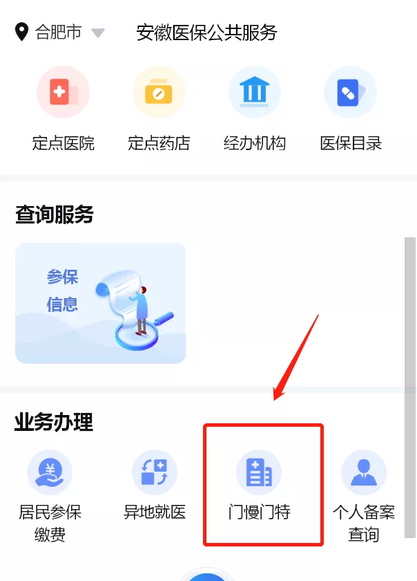完成后,页面往下拉,选择业务办理模块中的,选择“门慢门特”,进入后选择“门慢门特资格申请”。