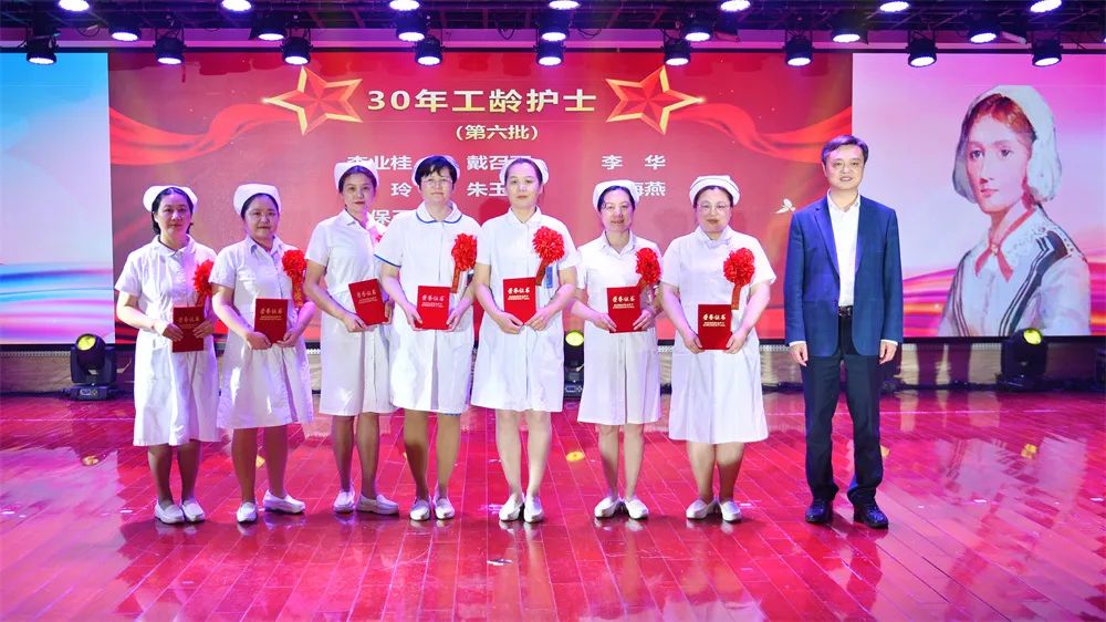 院领导及受邀嘉宾为获奖代表和30年工龄护士代表颁发奖状及证书并合影留念。